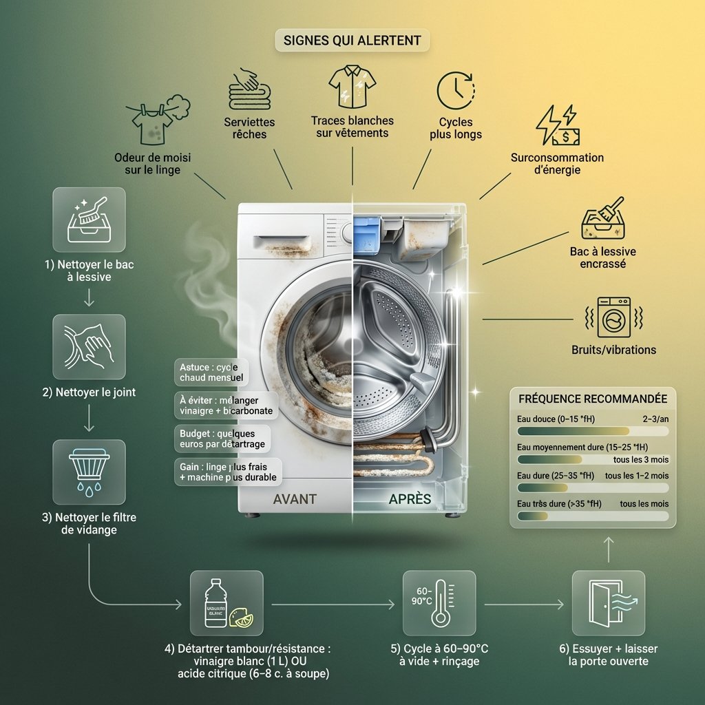 L’erreur classique : Penser que la lessive anticalcaire remplace le détartrage. Ces lessives limitent les dépôts de calcaire sur le linge, mais elles ne nettoient pas les composants internes de la machine. Le détartrage reste indispensable.